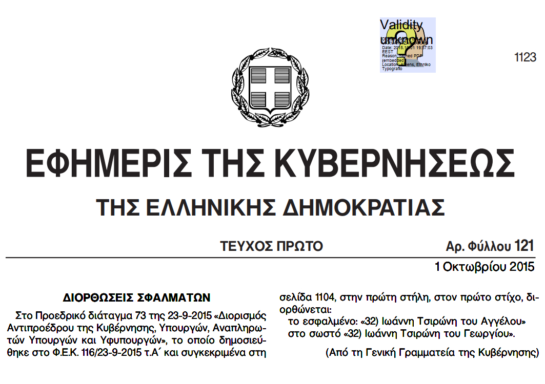 ΑΝΤΙ ΑΥΤΟΥ ΤΟ ΜΟΝΟ ΦΕΚ ΠΟΥ ΥΠΑΡΧΕΙ, ΤΗΝ 1Η ΟΚΤΩΒΡΙΟΥ 2015, ΕΙΝΑΙ ΑΥΤΟ ΠΟΥ ΠΑΡΟΥΣΙΑΖΟΥΜΕ ΣΤΗΝ ΠΑΡΑΚΑΤΩ ΦΩΤΟΓΡΑΦΙΑ ΚΑΙ ΑΦΟΡΑ «ΔΙΟΡΘΩΣΕΙΣ ΣΦΑΛΜΑΤΩΝ ΣΤΟ ΠΡΟΕΔΡΙΚΟ ΔΙΑΤΑΓΜΑ ΥΠ ΑΡΙΘΜ. 73»!!!